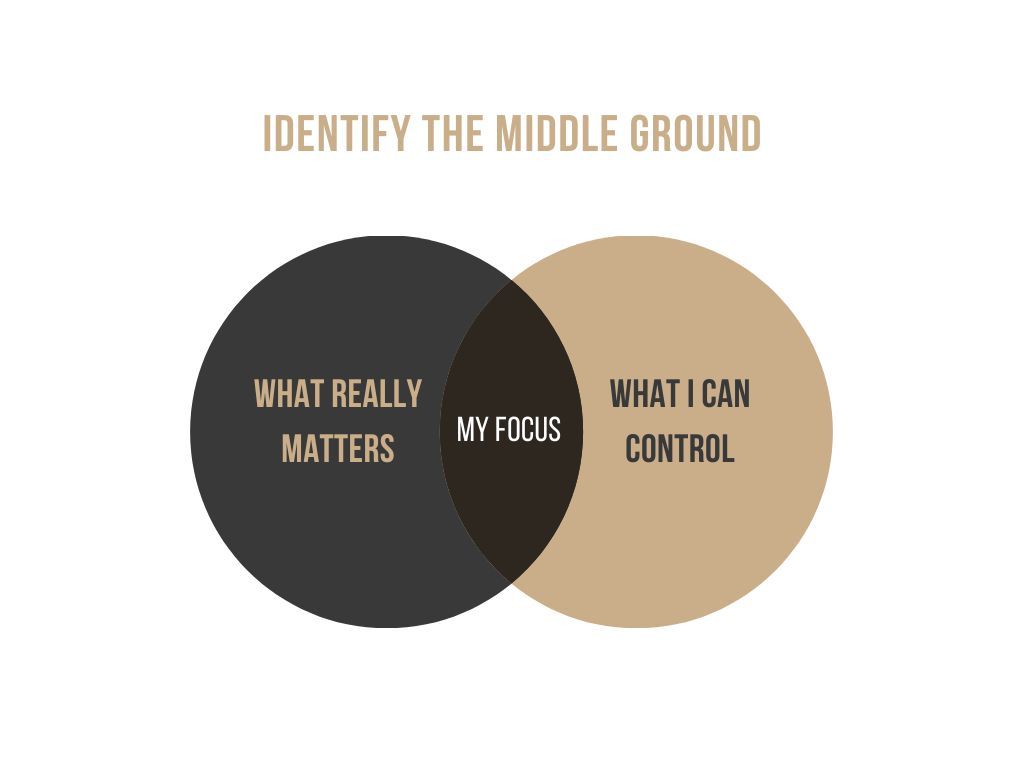 After you define each side of the diagram, observe what ends in the middle. Focus on that. Now, in all honesty, identifiying "what really matters" can become ambiguous or overwhelming. There'll be situations where every element matters. However, you must remember that not all elements fall under your control. That is why identifying these 2 areas and their respective intersection is important.